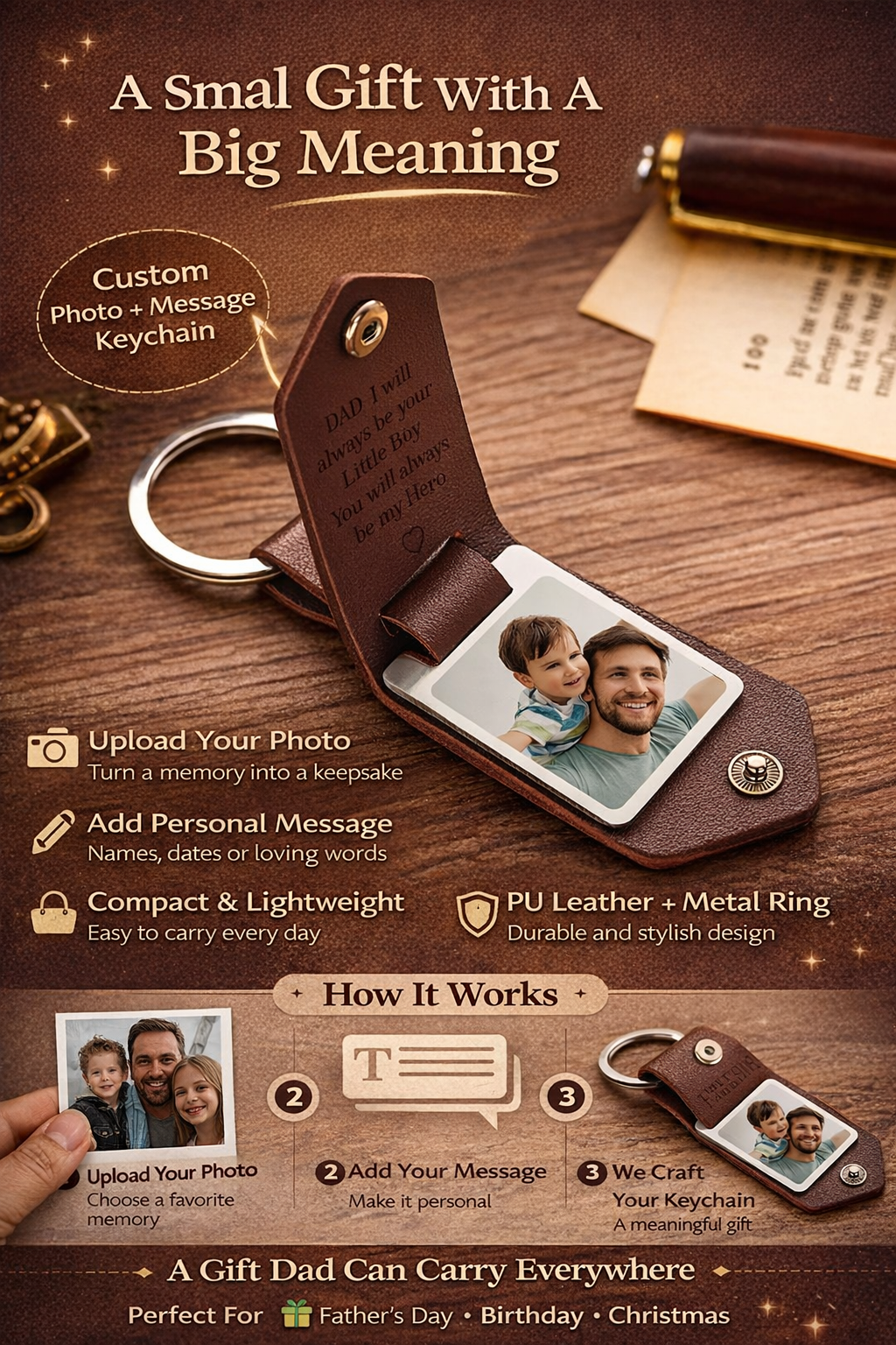 Upload a meaningful photo and we turn it into a beautiful personalized keychain.
